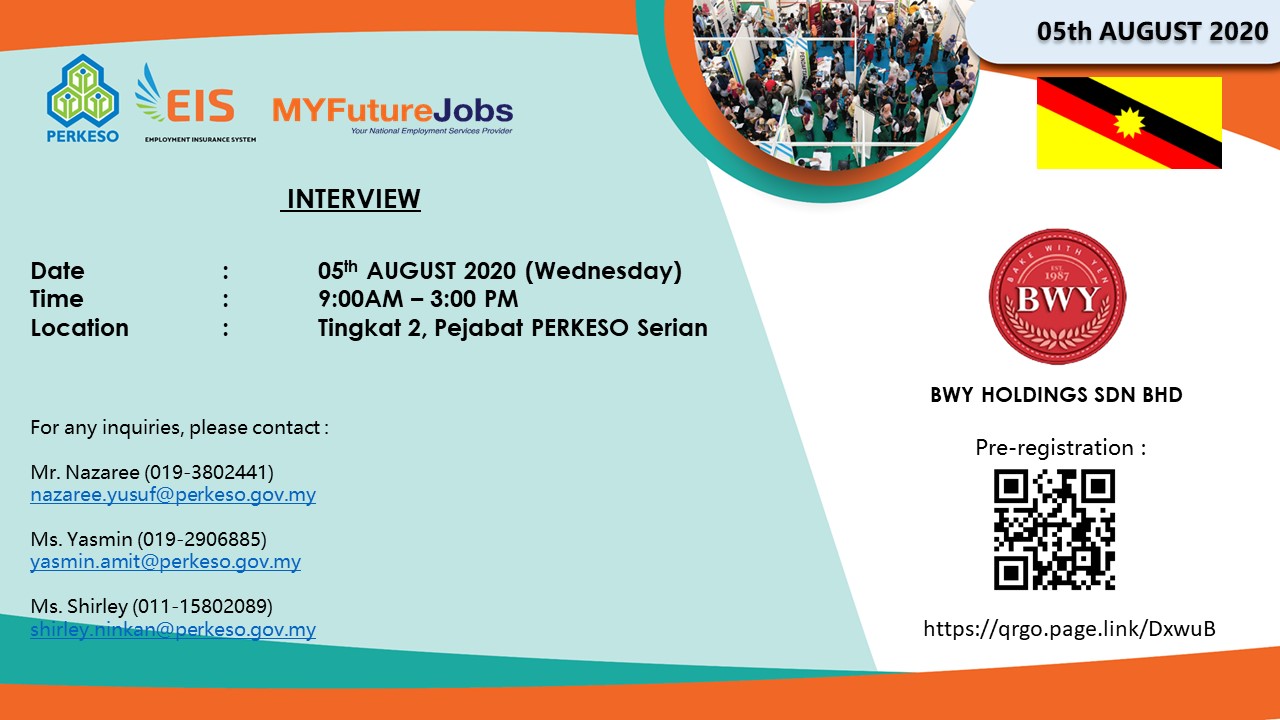 Employment Insurance System On Twitter Temuduga Terbuka Mingguan Sarawak Tarikh 5 Ogos 2020 Rabu Masa 9 00 Pagi 3 00 Petang Tempat Tingkat 2 Pejabat Perkeso Serian Majikan Yang Terlibat 1 Bwy Holdings