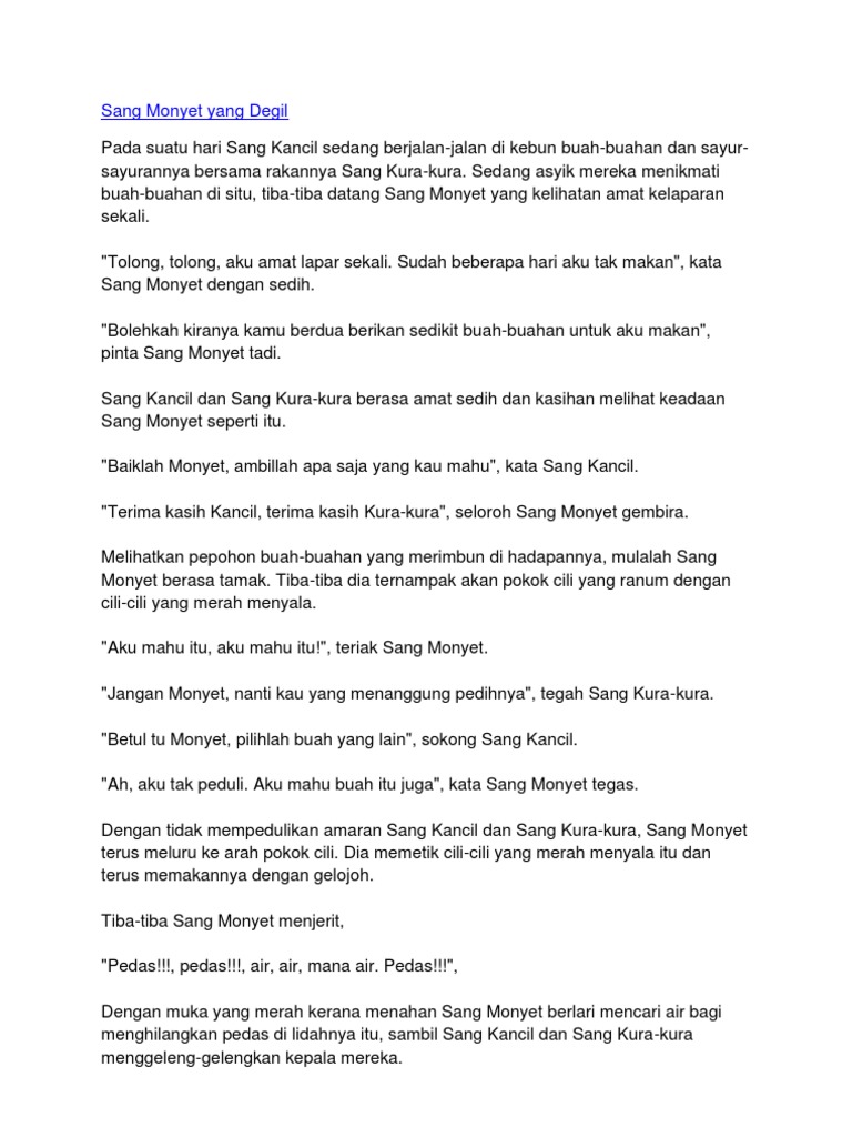 Sang kancil memberi alasan yang tugasnya hanya untuk menunggu dan bukan memalu gong itu. Cerpen anak cerpen fabel hewan lolos moderasi pada. Cerita sang kancil dan monyet cerita lama cerita kanak kanak pengajaran.