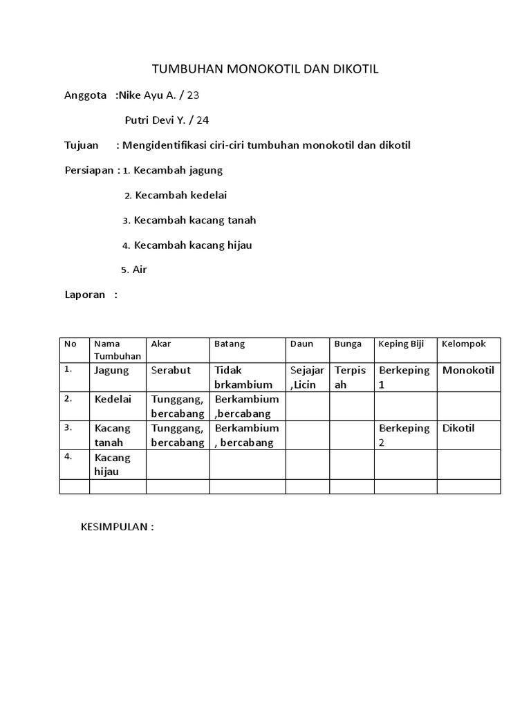 Sebutkan Tumbuhan Monokotil Dan Dikotil Dengan Nama Tumbuhan Akar Batang Daun Bunga Keping Brainly Co Id