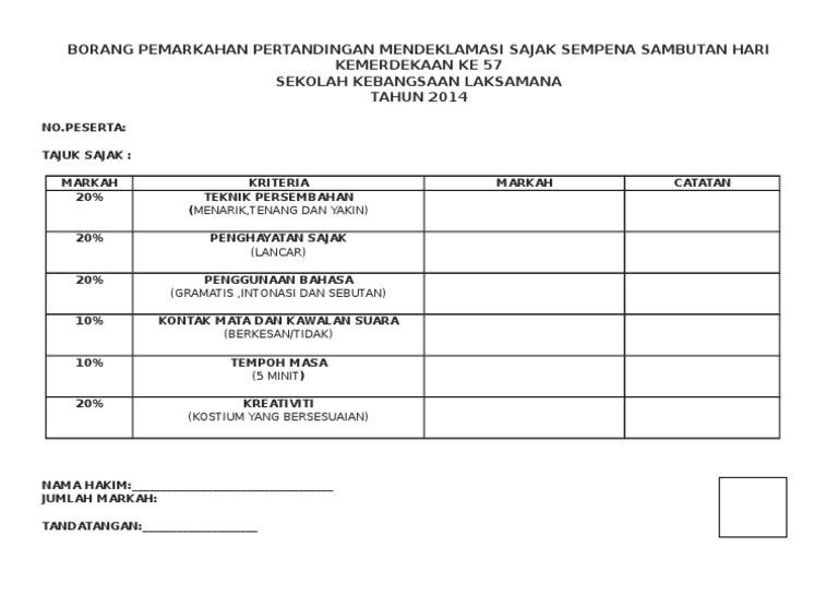 Doc Borang Pemarkahan Pertandingan Deklamasi Sajak Bulan Kemerdekaan Sempena Ulang Tahun Kemerdekaan Negara Ke 57 Sekolah Kebangsaan Pasir Besar 73420 Gemas Negeri Sembilan Farah Farhana Academia Edu