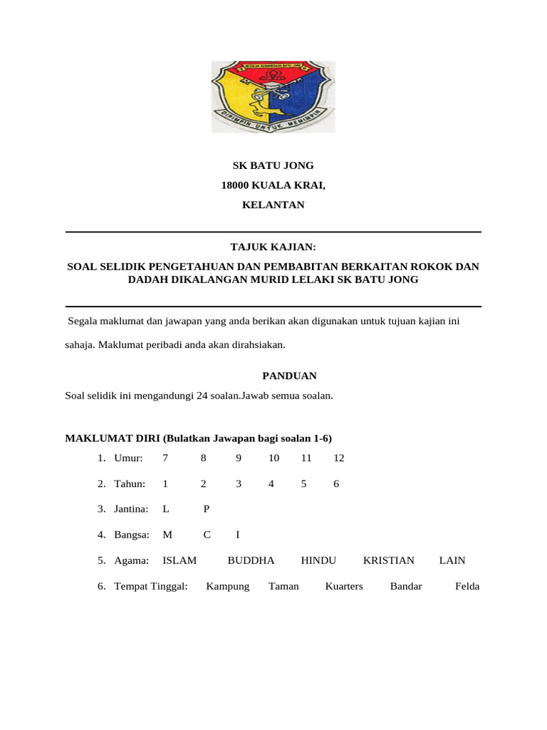 Borang Soal Selidik Kajian Merokok Dikalangan Pelajar Docx Document