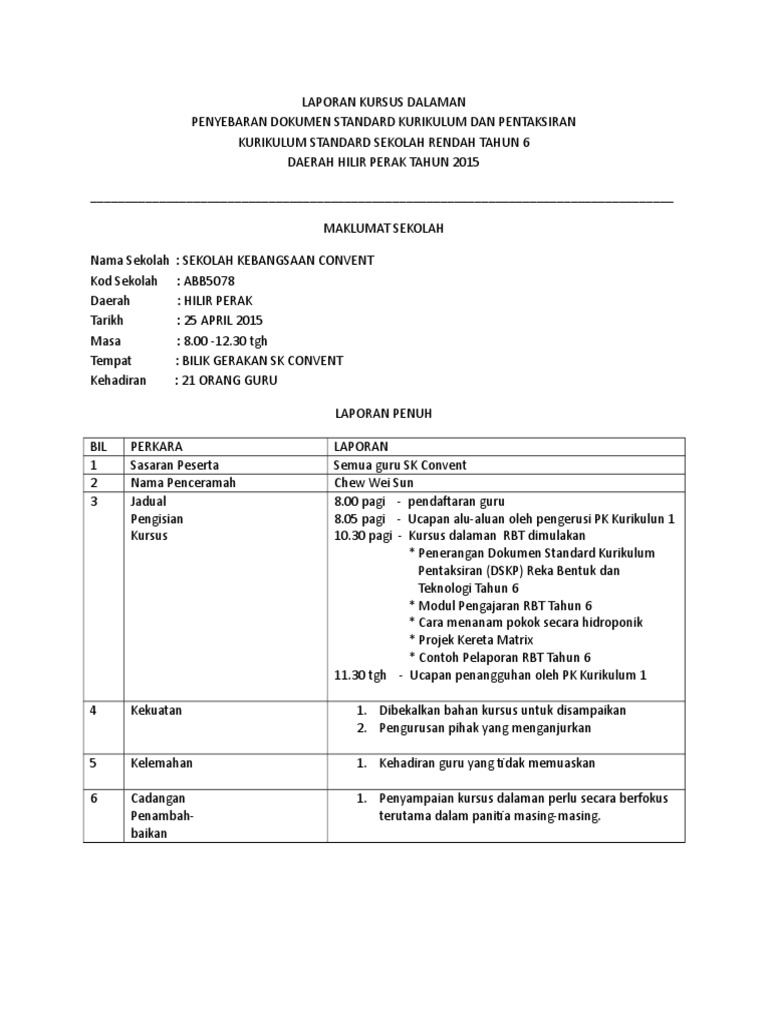 Doc Laporan Pelaksanaan Kursus Dalaman Sekolah Penyebaran Dskp Kssr Sejarah Tahun 6 Negeri Perak 2015 Abdazizahmad Azizahmad Academia Edu