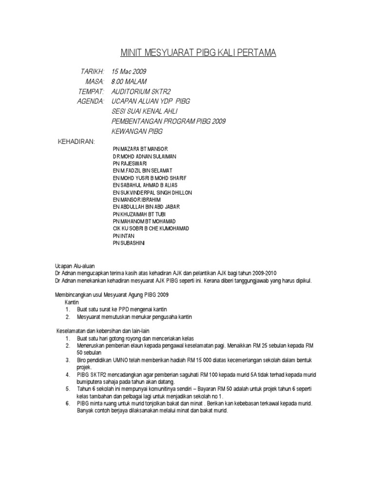Contoh minit mesyuarat pibg kali pertama. Minit meyuarat ajk pibg smaskp kali ke 1 sessi 2008 tarikh. 18 mei 2008 masa. Minit mesyuarat ahli jawatankuasa pibg sesi 2015 1 1.